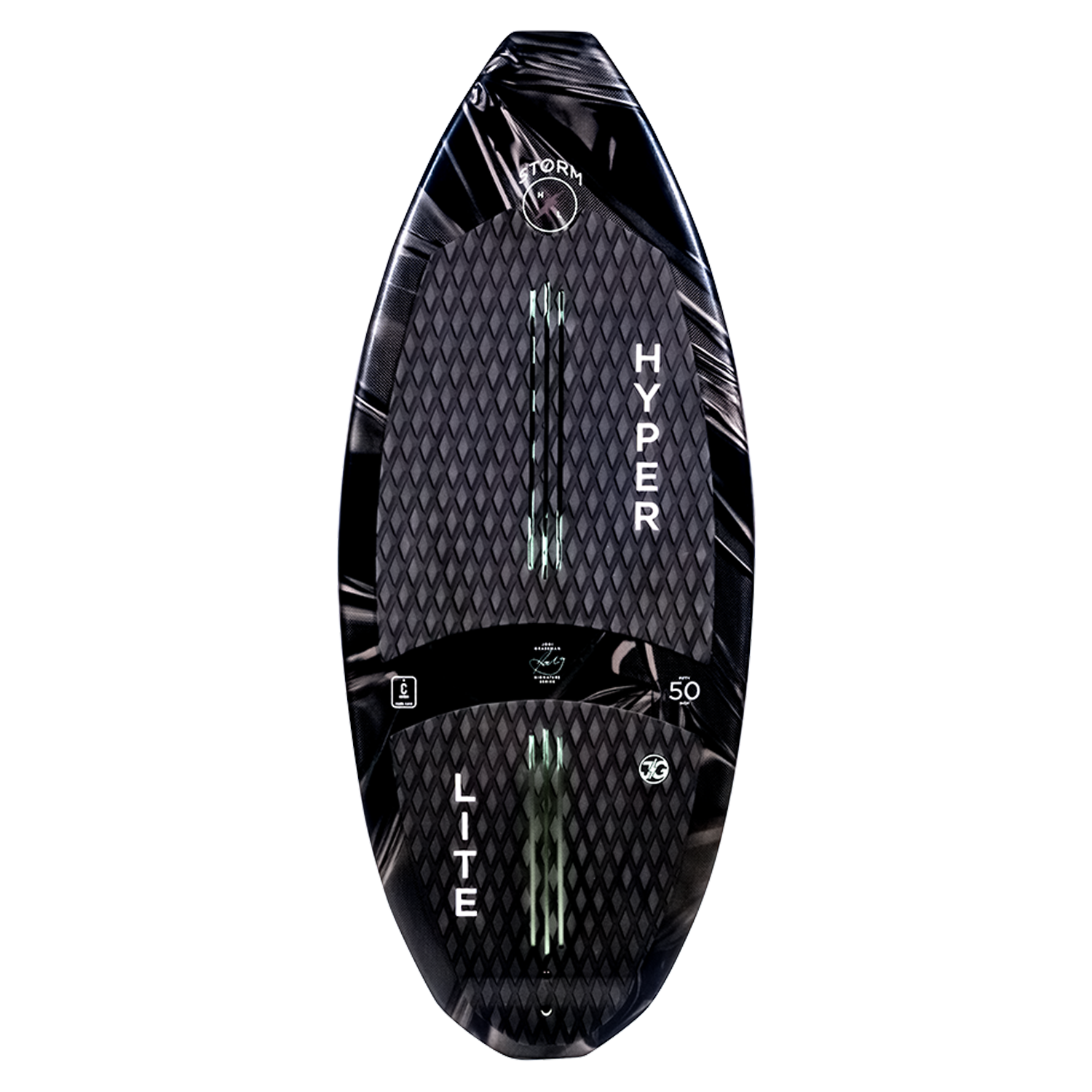 Building a shape that could keep up with world champion wakesurfer Jodi Grassman was the challenge, her new pro model skim shape is the resolution, introducing the Storm. Jodi’s aggressive riding style demanded a board that would carry speed and generate lift off the wave for her deep bag of tricks. The Storm features a wider tail to help generate the needed speed while the blunt tip/tail profile provide a manoeuvrable ride that tracks exceptionally well riding switch. Hyperlite’s woven carbon and Nova core construction yield a responsive and snappy feel meeting the standards of Jodi Grassman.