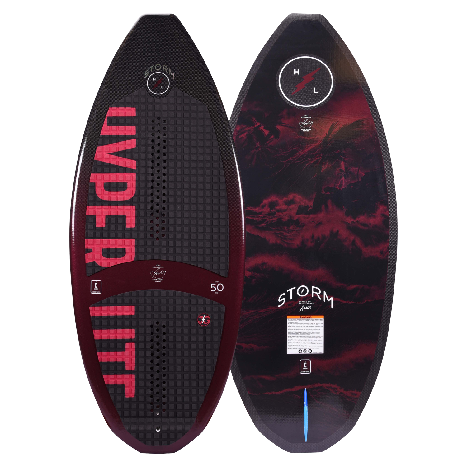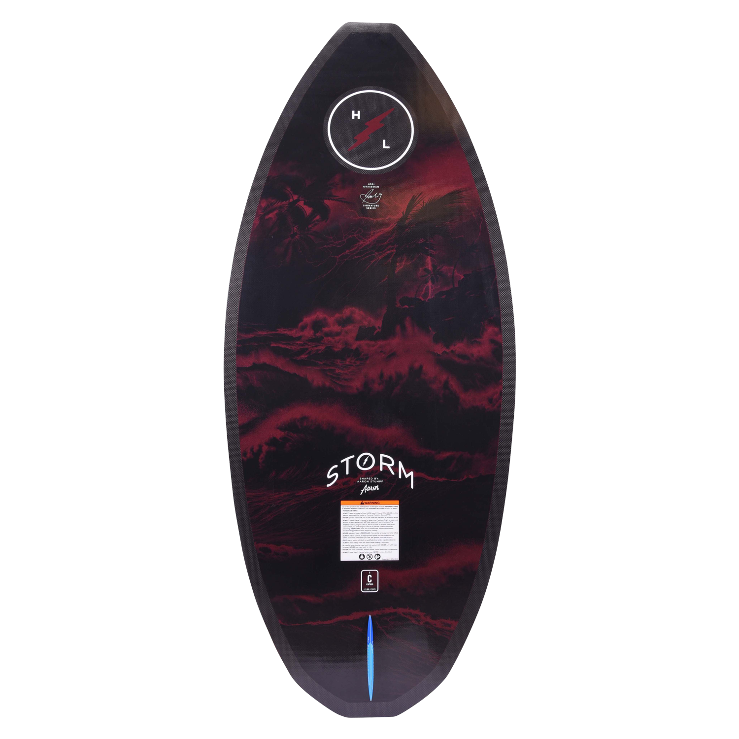 Building a shape that could keep up with world champion wakesurfer Jodi Grassman was the challenge, her new pro model skim shape is the resolution, introducing the Storm. Jodi's aggressive riding style demanded a board that would carry speed and generate lift off the wave for her deep bag of tricks. The Storm features a wider tail to help generate the needed speed while the blunt tip/tail profile provide a maneuverable ride that tracks exceptionally well riding switch. Hyperlite's woven carbon and Nova core construction yield a responsive and snappy feel meeting the standards of Jodi Grassman.