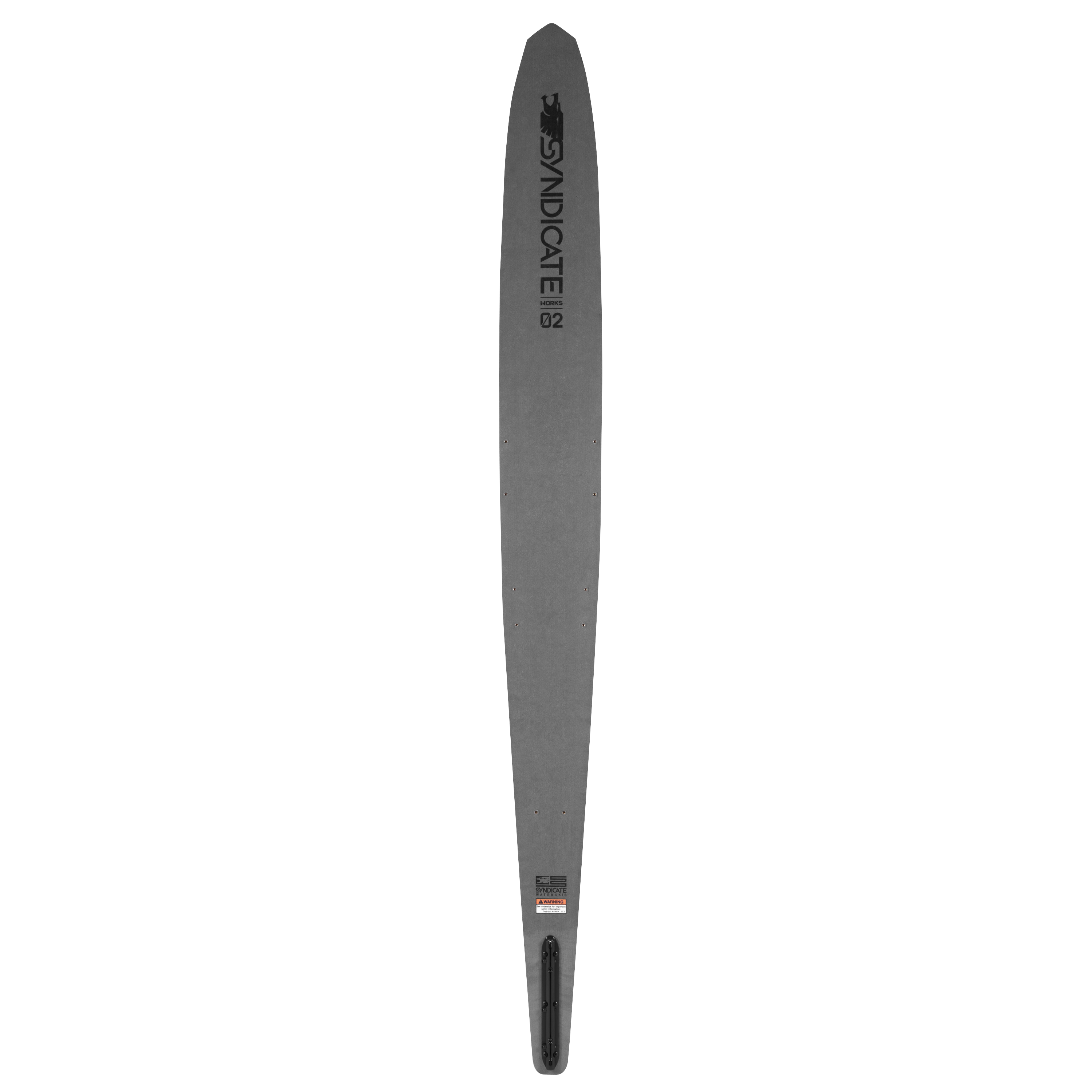 The Syndicate Works 02 has a wide forebody, giving the skier great support and a stable platform to stand on. The wider forebody is balanced with a high-volume concave and a more aggressive tip rocker for increased maneuverability, good acceleration, tight wrapping turn on the finish of the buoy.